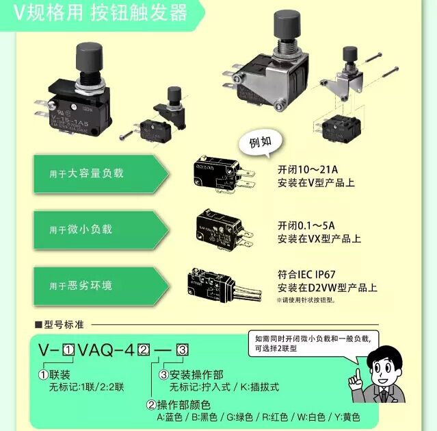 2、微動開關可通過自由組合方式設定按鈕,適用對象涵蓋從微小負載到密封構造的廣泛領域
