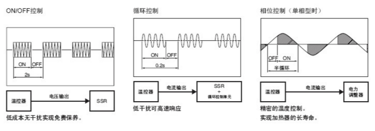 相位控制接受溫控器的電流輸出4~20mA的信號, 使輸出量每半循環(huán)發(fā)生變 化??蛇M(jìn)行高精度的溫度控制, 多用于半導(dǎo)體制造裝置中。