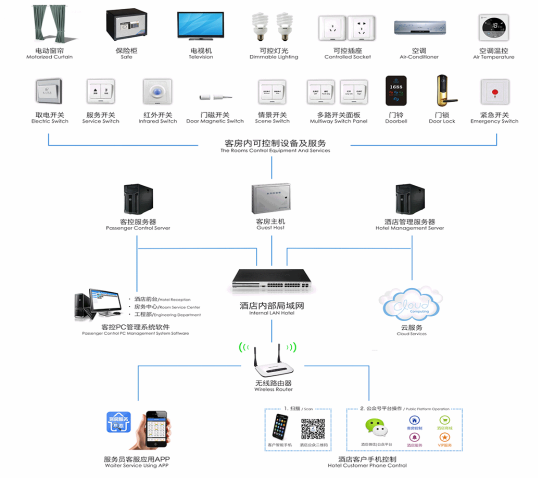 客房智能控制主機(jī)、客房控制面板和客房管理軟件三部分組成客房智能控制系統(tǒng),并可以根據(jù)客戶需求自由組合和擴(kuò)展模塊。通過(guò)弱電控制強(qiáng)電的方式,實(shí)現(xiàn)對(duì)照明、排氣扇、空調(diào)、窗簾、音視頻及服務(wù)信息等功能控制。采用TCP/IP協(xié)議或CAN-BUS總線組網(wǎng),能夠?qū)崿F(xiàn)遠(yuǎn)程管理與控制,還可以與蘋(píng)果(IOS)、安卓(Android)系統(tǒng)的移動(dòng)終端設(shè)備無(wú)縫連接,可由移動(dòng)終端設(shè)備進(jìn)行控制,為客房營(yíng)造典雅、溫馨、舒適的環(huán)境,實(shí)現(xiàn)酒店的智能控制、綠色環(huán)保和高效管理。