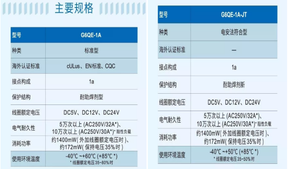 從線圈電壓功耗方面看,G6QE系列在施加電壓100毫秒之后降低施加至線圈上的電壓與額定線圈功耗相比,其功耗減小至12%,有助于設備的節能和降低發熱。