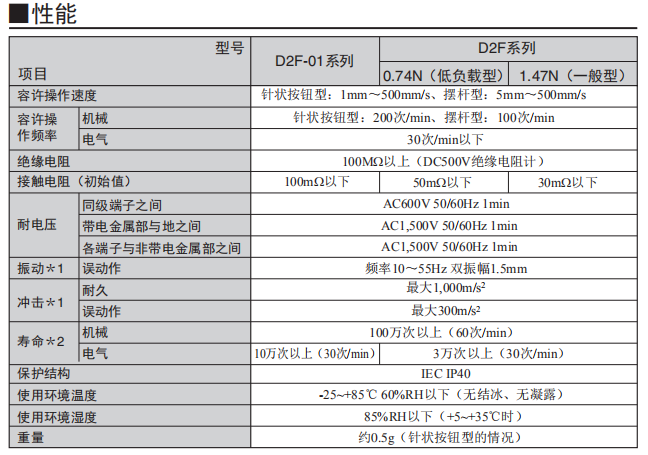 歐姆龍微動開關D2F系列產(chǎn)品性能: