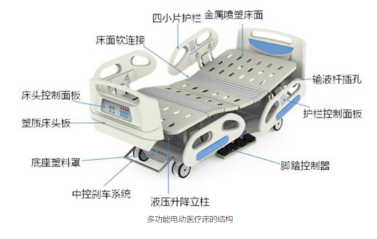 多功能電動醫療床由ABS床頭、ABS提升護欄、床板、上床架、下床架、升降連桿、電動推桿、控制器、手控板萬向輪等主要部件組成。