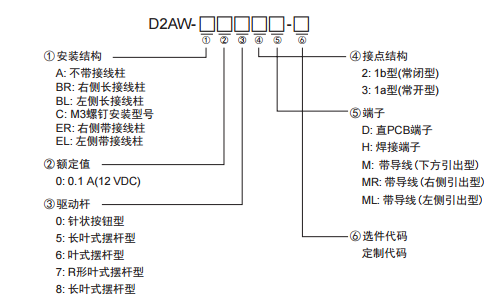 歐姆龍D2AW微動開關(guān)具有小型的外觀尺寸,并且根據(jù)安裝結(jié)構(gòu)、額定值、驅(qū)動桿類型、節(jié)點結(jié)構(gòu)、端子以及定制代碼的不同,可提供多種型號產(chǎn)品,以便客戶根據(jù)實際應(yīng)用需求進行選擇。