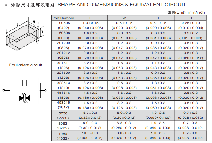 特征: 1、疊層片式陶瓷結構。 2、無引線。 3、溫度范圍:-55℃~+125 ℃。 4、工作電壓范圍V w(dc)=3.3~ 615V。 5、具有雙向限制特性,適合ESD保護。 6、漏電流非常小。 7、寄生電感小、響應速度快(響應時間少于0.5ns)。 8、優良的溫度系數。 9、良好的焊接性能(端電極為三層電鍍)。 應用: 1、防止過電壓:當施加的電壓升高到壓敏電壓時,壓敏電阻器的電流急劇上升,被保護設備的浪涌電壓迅速減小,從而使裝有壓敏電阻器的設備抗浪涌噪聲能力達到相應要求。